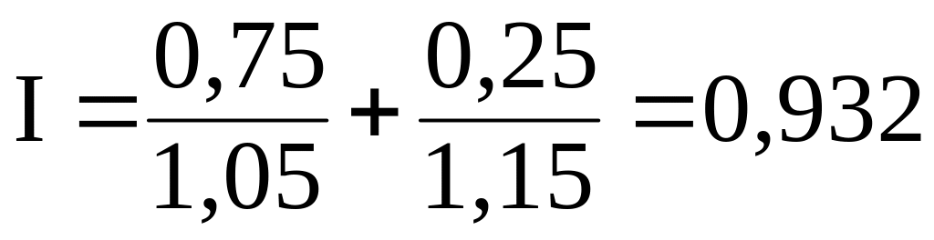 2.2.3. Задача : визначити індекс купівельної спроможності грошової одиниці, якщо індекс цін на товари дорівнює 1,05, а індекс цін на послуги – 1,15 за певний період. Частка купівель товарів у загальних витратах населення за цей період становить 75%.
