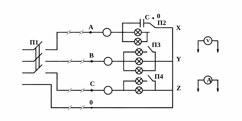 Навантаженнями є лампи накалювання, що являють собою активний опір. Перемикачі П3 і П4 служать для зміни навантаження у фазах В і С. Перемикач П2 служить для зміни активного навантаження на ємнісне у фазі А, вимикач П1 служить для підключення досліджуваного ланцюга до джерела живлення.