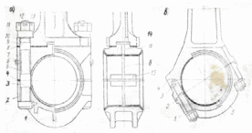 Ремонт шатуна с отъемной головкой проще, чем у шатуна с неотъемной головкой, хотя общая масса его больше. Для шатунной шейки кривошипа коленчатого вала в нижней головке имеется подшипник, называемый кривошипным. Внутренняя поверхность половинок 2 и 7 в отъемной головке заплавляется антифрикционным сплавом без вклады Рис. 3. Нижние головки шатуна шей. Для заливки шатунных подшипников используются такие же сплавы, как и для заливки рамовых. В разъеме подшипника устанавливают наборы прокладок 4 для регулирования масляного зазора. Масло для смазки кривошипного подшипника поступает из осевого канала коленчатого вала на поверхность шейки через одно или 2 отверстия. При одном отверстии в подшипнике прорезается кольцевая канавка “б”. Из нее масло направляется в холодильники 15, затем через отверстие “а”, трубку 14 – к подшипнику верхней головки шатуна.