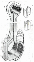 Основными элементами шатуна (рис. 1) являются верхняя (поршневая) головка 6, стержень 5, нижняя (кривошипная) головка 4. Верхняя головка шатунов дизелей выполняется заодно со стержнем неразъемной. Нижняя головка 4 делается разъемной (или отъемной) с крышкой, крепящейся болтами 3.