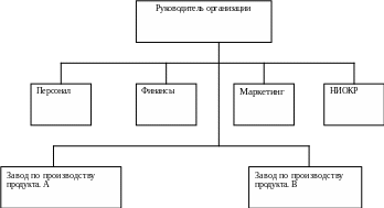 6. Продуктовая структура. Департаментизация (выделение относительно обособленных подразделений) осуществляется по отдельным продуктовым группам (например, производство мебели и производство сантехники). В свою очередь, структура каждой продуктовой группы строится по линейно-функциональному принципу. Продуктовые структуры отличаются большим количеством уровней, расширением и усилением роли среднего звена, а также определенной полицентричностью. В качестве центра второго уровня в организации выступает руководство соответствующих продуктовых групп. Основные структурные связи: вертикальные и горизонтальные в пределах отдельных продуктовых групп. Горизонтальные связи между разными продуктовыми группами минимизированы. Продуктовая структура ведет к умножению количества функциональных служб и к общему усложнению структуры организации.