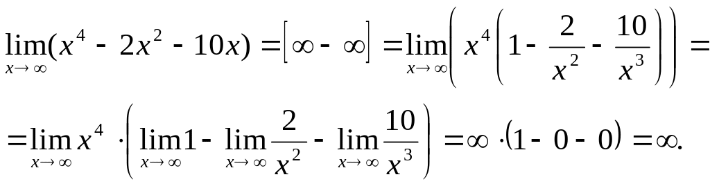 В случае степенных функций необходимо выносить за скобку в числителе и знаменателе дроби x с наибольшим показателем степени среди всех слагаемых дроби; в случае показательных функций за скобку выносится наиболее быстро возрастающее слагаемое, среди всех слагаемых дроби. После сокращения дроби неопределенность устраняется.