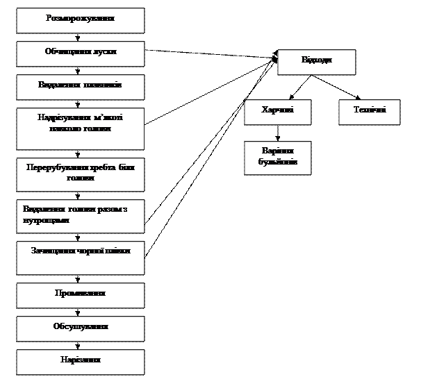 2. Використовують рибу середніх розмірів масою до 1,5 кг. Процес обробки складається з розморожування риби, обчищання луски, видалення плавників, голови, нутрощів (через отвір, що утворився після відтинання голови), промивання, нарізування (малюнок №38.).