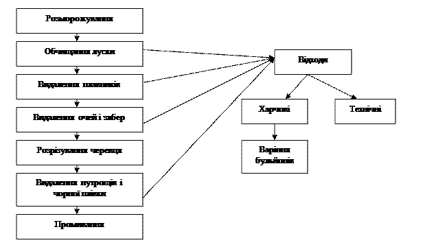 Кількість відходів при обробці тушки з головою становить 20 %, а тушки без голови - 35 %.