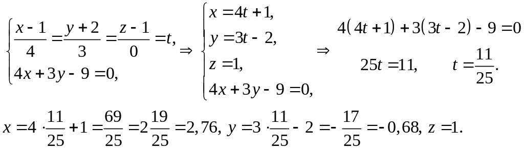 .Уравнения прямой и плоскости создают систему, решив которую получим точку пересечения прямой и плоскости