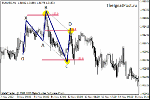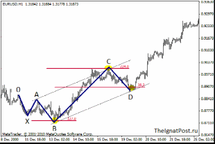 Пример медвежьего варианта паттерна - на рис. 2. Модель сформирована в нисходящем канале, после окончания точки D последовало значительное снижение цены.