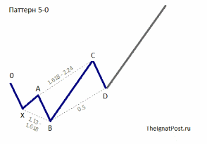 Паттерн 5-0 является самой молодой гармоничной моделью. Первые материалы С.Корнея, посвящённые ему, публиковались в 2004-2005 гг. Сразу же перейдём к разбору этой модели (см. рис. 1).