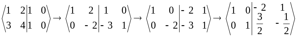 До даної матриці А справа допишемо одиничну матрицю Е. За допомогою елементарних перетворень над рядками матриці (A|E) матриця А зводиться до одиничної матриці: