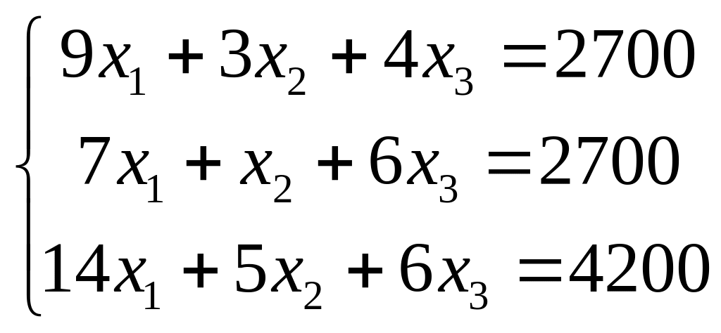 Припустимо, підприємство щодня виробляє х1 одиниць виробів виду α, х2 одиниць – β і х3 одиниць виробів виду γ. Тоді відповідно з витратами сировини кожного виду, маємо систему