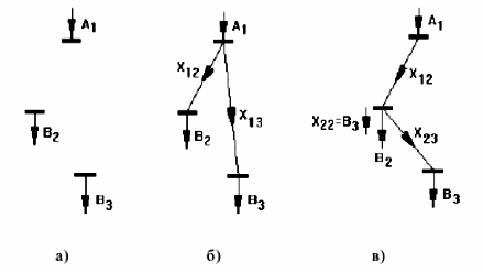 На рис.2.1,а показано взаимное расположение узлов источника А1 и потребителей В2 и В3. При классической постановке транспортной задачи оптимальная схема электрической сети будет иметь вид, показанный на рис. 2.1,б. Очень возможно, что эта схема будет дороже, чем схема, приведенная на рис. 2.1,в, в которой мощность к потребителю В3 передается через промежуточный (транзитный) узел потребителя В2. Величина транзитной мощности, передаваемой через узел В2, равна мощности потребителя В3, т.е. х22=В3.