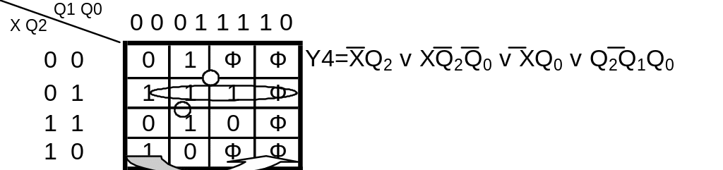 На карте показаны группы склеенных клеток. Соседние клетки, содержащие значения 1 и Ф склеиваются. Можно склеивать число клеток кратное степени двух – 2, 4, 8, 16. Каждой группе клеток соответствует импликанта их покрывающая. Импликанты в формуле соединяются знаком дизъюнкции. Добавление в группу двух клеток уменьшает количество переменных в импликанте на 1. В импликанту входят переменные значения которых одинаково в наборах всех клеток. Если значение переменной в наборах равно единице, то переменная входит в импликанту в прямом виде, если нулю, то – в инверсном. Если единица расположена на карте изолированно, то ей соответствует конституента 1, содержащая все переменные в соответствии с набором, на котором она получена. При разбиении клеток на группы следует придерживаться таких положений: Каждую единицу нужно включить в как можно крупную группу; количество групп должно быть как можно меньше, то есть не следует объединять единицы в группу, если все они уже объединены в других группах. Далее на рис.1 приведена модель преобразователя в Excel, формула вычисления Y4, отображается в строке формул.