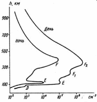 Ниже для общего представления приведены характерные полуденные и полуночные высотные распределения электронной концентрации средних широт. Приведены и названия различных слоев ионосферы.