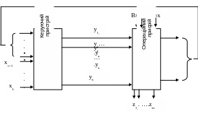 Формування керуючих сигналів у1, у2….уn ( рис.1.1) для виконання певних мікрокоманд може залежати від стану вузлів операційного пристрою, котрі визначаються сигналами х1, …,хs і які передаються з відповідних виходів операційного пристрою на входи керуючого пристрою. Керуючі сигнали у1, у2….уn можуть залежати також від зовнішніх сигналів хs+1, …,хL