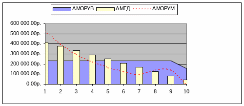 Добавьте лист в книгу и внесите соответствующие результаты расчета функций АМОРУВ, АМОРУМ и АМГД и постройте график по этим результатам (см. таблицу 2 и рисунок 5).