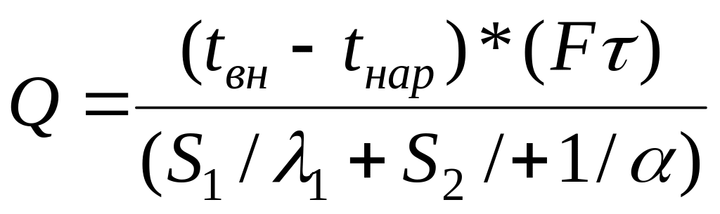 где Q – количество передаваемого тепла, Дж/(м2*с); t1 и t2 — температуры на противоположных поверхностях стенки, К (°С); S —толщина стенки, м; λ — коэффициент теплопроводности материала при температуре, средней между t1 и t2 Вт/(м*К).