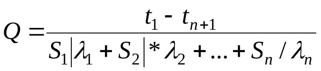 Удельное (отнесенное к 1 с и 1 м2 поверхности) количество тепла, которое передается через многослойную плоскую стенку, состоящую из n слоев различных веществ, равно, Дж/(м2*с),