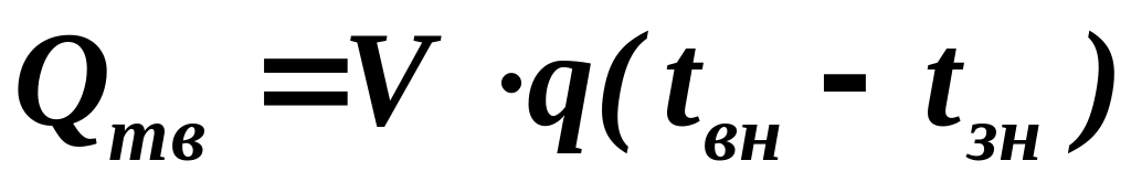 q – питомі втрати теплоти будівлі, кВт/(м3•К), залежать від виду будівельних матеріалів, їх товщини, наявності повітряних прошарків і т.п.;