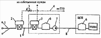 1 - скважины; 2 - сепаратор 1-й ступени; 3 - регулятор давления типа "до себя"; 4 - газопровод; 5 - сепаратор 2-й ступени; 6 - резервуары; 7 - насос; 8 -нефтепровод; УСП - участковый сборный пункт; ЦСП - центральный сборный пункт.