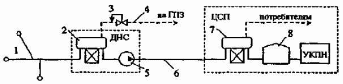 1 – скважины, 2 – сепаратор первой ступени, 3 – регулятор давления типа «до себя», 4 – газопровод, 5 – насос, 6 – нефтепровод, 7 – сепаратор второй ступени, 8 - резервуар, ДНС – дожимная насосная станция.