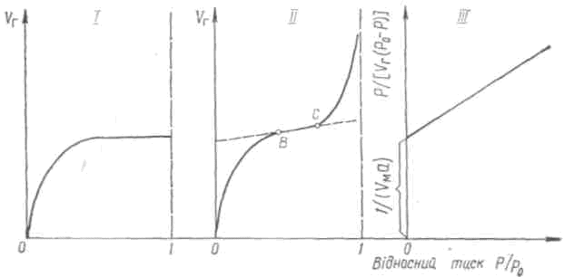 За експериментальними даними, ізотермами мономолекулярної ленгмюрівської адсорбції (рисунок Б.1, І) описується тільки незначна кількість процесів низькотемпературної фізичної адсорбції. Більшість, процесів характеризуються ізотермами полімолекулярної адсорбції типу ІІ, за формою яких, використовуючи теорію БЕТ, можна визначити питому площу поверхні адсорбенту. На таких експериментальних ізотермах є прямолінійний відрізок ВС. Точка В, у якій він починається, вказує на закінчення заповнення моношару (теорія БЕТ дозволяє знайти координати цієї точки аналітичним способом).