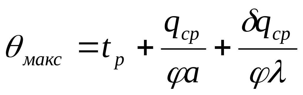 При известной тепловой напряженности труб змеевика максимальная температура стенки трубы (θмакс, °С) может быть определена по формуле