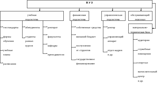 Объект – ВУЗ, модель состава: учебная система, абитуриенты, студенты, преподавательский состав, система финансирования, управляющий состав, обслуживающий состав.