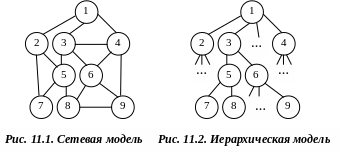 Сетевая модель данных предназначена для представления данных сетевой структуры (рис. 11.1) и манипулирования ими. Такая модель обеспечивает представление данных о предметной области в виде элементов данных, которые могут быть связаны всеми типами отношений – 1:1 (один-к-одному), 1:М (один-ко-многим), М:1 (многие-к-одному), М:M (многие-ко-многим). В этой модели данных каждый элемент данных может иметь несколько «подчинённых» и несколько «старших». Достоинство сетевых моделей – минимальные затраты памяти, а недостаток – большое время поиска информации.