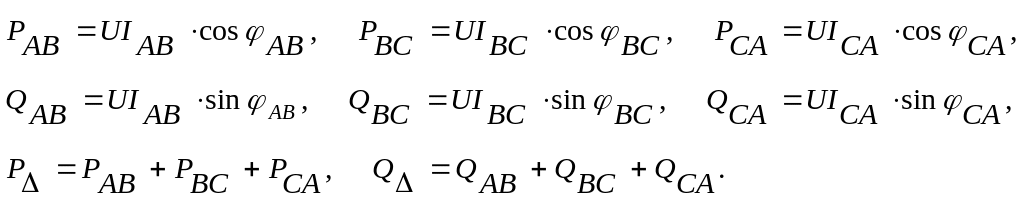 Активну, реактивну і сумарну потужності фаз кола знаходять як: