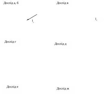За результатами вимірювань побудувати в масштабі шість векторних діаграм, приклади побудови за допомогою циркуля діаграм показані на мал.3.3: для активного симетричного навантаження мал. 3.3, досліди «а» і «б»; для активного несиметричного навантаження мал. 3.3, дослід «в»; для активного несиметричного навантаження в трипровідноковій системі мал. 3.3, дослід «г»; для активно-емнісного навантаження у чотирипровідниковій системі мал. 3.3, дослід «д»; для активного рівномірного навантаження в чотирипровідниковій системі при обриві лінійного проводу мал. 3.3, дослід «е» ; для активного рівномірного навантаження в трипровідниковій системі при обриві лінійного проводу мал. 3.3, дослід «ж».