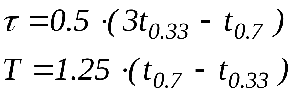 Расчет основан на обработке координат двух характерных точек по оси ординат: 0.33Δθ и 0.7Δθ (рис.11). Из этих точек проводятся линии параллельные оси абсцисс до пересечения с переходной характеристикой. Затем из полученных точек опускаются перпендикуляры на ось абсцисс и, определяются соответственно значения времени t0.33 и t0.7.