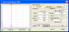 На рис. 10 представлена передняя панель анализатора спектра с изображением амплитудного спектра положительного гармонического сигнала S(t)=1+Sin(21000t). Спектр сигнала содержит две гармонических составляющих с амплитудами, равными 1 В (постоянную составляющую с частотой 0 Гц, основную гармонику с частотой 1000 Гц).