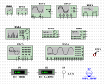 Рис. 4. Панель приборов и их изображения: виртуальных приборов: мультиметра XMM1, генератора сигналов XFG1, двух- и четырехканальных осциллографов XCS1, XCS2, плоттера Боде XBP1, анализатора спектраXSA1; эмулированных реально-существующих приборов: функционального генератора XFG2, мультиметра XMM2, осциллографов XSC3 и XSC4, пробника XCP1; регистрирующих приборов из библиотеки индикаторов: вольтметра U1, амперметра U2, пробника напряжения X1, лампы накаливания Х2. |