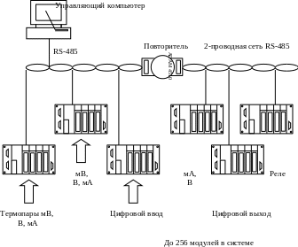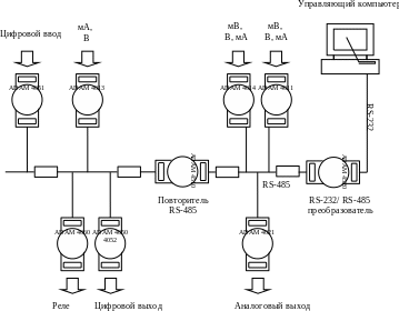 Рис. 2.26. Распределенная структура условной подсистемы контроля и управления на базе модулей серии ADAM-4000