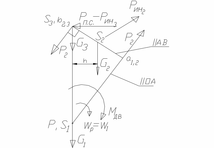 Рисуют начальное звено (кривошип) механизма, т. е. у начального механизма отбрасывают стойку. К начальному звену по направлению угловой скорости ω1 прикладывают движущий момент М∂1 и на оси вращения кривошипа – силу тяжести G1. Действие на начальное звено отброшенных звеньев 2 и 3 заменяют соответствующими реакциями R21 и R31
