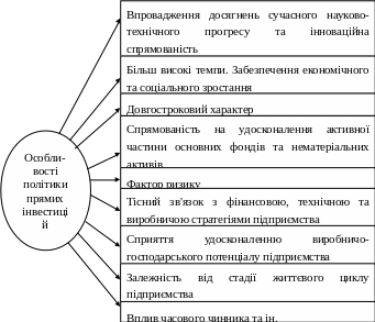 Політика реальних прямих або виробничих інвестицій є складовою частиною інвестиційної політики підприємства. Її особливості, що наведені на рисунку 8.2, потребують урахування в аналізі інвестиційних проектів.