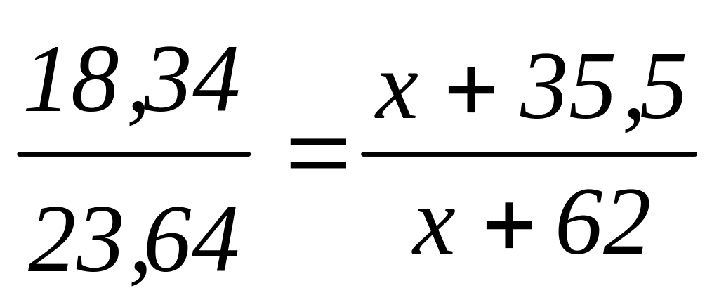 При рішенні подібних завдань необхідно пам'ятати, що молярна маса еквівалента складної речовини дорівнює сумі молярних мас еквівалентів його складових частин. Допустимо, що молярна маса еквівалента невідомого металу дорівнює х г/моль. З огляду на, те що молярна маса еквівалента хлорид-аніона Сl – = 35,5 г/моль, а молярна маса еквівалента нітрат-аніона NO–3 дорівнює 62 г/моль і підставивши значення величин у рівняння закону еквівалентів, одержимо: