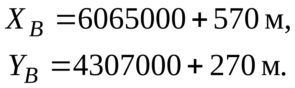 Прямокутні координати визначають за допомогою координатної сітки, що нанесена на карті рис.14. Кординати точки В з висотою 214,3 м, що знаходиться на карті, визначають за формулами: