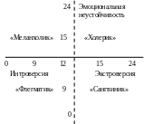 Сопоставление факторов "экстраверсии-интроверсии" и "эмоциональной устой-чивости" позволяет, по мнению Г.-Ю. Айзенка, определять тип темперамента человека. Для этого полученные по данным факторам значения откладывают на ортогональных осях координат. В зависимости от того, в какой квадрант попадает точка пересечения проекций откладываемых значений, определяется тип темперамента человека (см. рисунок).