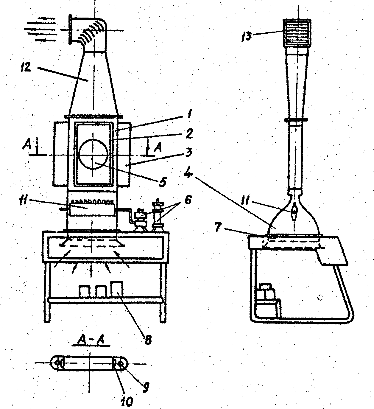 Повітря засмоктується з приміщення і викидається вентилятором в атмосферу. Робоча частина 1 труби виконана у вигляді каналу прямокутного перетину. У передній стінці корпусу труби є вікно, яке закрите рамкою зі склом 2. Скло виймається з вікна під час переміщення рамки догори. Бічні стінки корпусу мають подовжні пази зі вставленими в них циліндровими лінзами 10. Світло від двох ламп, що знаходяться в освітлювачах 3, виходить стрічним паралельним промінням через лінзи, освітлюючи середні частини прозорих моделей. На поворотному диску 5 задньої стінки корпусу встановлюються моделі, обтікання яких вивчається. Поверхня задньої стінки корпусу труби і диск обклеєні чорною тканиною, яка поглинає світло. Під робочою частиною труби знаходиться сопло 4 із ступенем стиснення струменя, рівного чотирьом. Таке звуження потоку, що входить в робочу частину труби, сприяє зменшенню початкової турбулентності потоку і збільшенню критичного числа Рейнольдса. На вході в сопло встановлена вирівнююча сітка 7, а на виході з нього, на деякій відстані від входу в робочу частину аеродинамічної труби, розташована гребінка 11, призначена для введення в потік візуалізуючої домішки. Гребінка є симетричною оболонкою обтічної форми, у середині якої знаходиться трубка з двостороннім входом. До цієї трубки припаяні численні патрубки малого діаметру, через які в потік поступає візуалізуюча домішка. На фланець корпусу зверху встановлений вихлопний патрубок 12 з вмонтованими в його коліно направляючими лопатками 13. До фланця коліна вихлопного патрубка приєднана, труба вентилятора (на рисунку не показана), на виході з якого встановлена поворотна заслінка, яка регулює витрату повітря. Вентилятор, крім того, має дві швидкості обертання. Поряд з аеродинамічною трубою на столі розташований парогенератор 6, який сполучений з гребінкою 11.