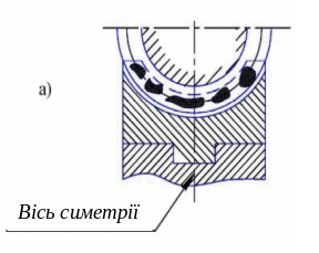 г) Для регулювання зачеплення, на робочу поверхню витків черв'яка наносять тонкий шар фарби, після чого, обертаючи черв'як, повертають черв'ячне колесо. Спостерігаючи через оглядове вікно редуктора отриману пляма контакту - відбиток фарби на робочих поверхнях зубів колеса - судять про те, наскільки правильно зібрано зачеплення.
