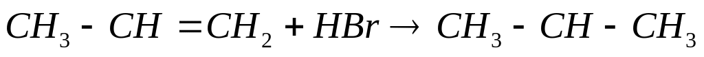 Мұндай заңдылықты қалай түсіндіруге болады? Енді осыны қарастыралық. Пропиленнің этиленнен айырмашылығы- оның молекуласында СН3 радикалы бар. Міне осы радикалдың қос байланысқа әсер етуінен қосылу реакциясы қалай болса солай жүрмей, белгілі бағытта жүреді. Енді осы әсердің мәні неде? Метил радикалындағы С - Н элементтердің теріс зарядтығының әртүрлі болуы салдарынан көміртек атомы байланыстығы сутек атомдарымен бірігіп электрон тығыздығы өз жағына қарай ығыстыратындықтан теріс зарядталады. Оның әсерінен артық электрон тығыздығы радикалмен көршілес көміртек атомына қарай ығысады, осының салдарынан σ - байланысының өте қозғалғыш бұлтын көміртегінің ең шеткі атомына қарай ығыстырады. Электрондардың мұндай ығысуын структуралық формулада былай бейнелеуге болады: