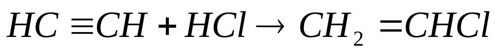 Галогенсутектердің қосылуы. Бұл реакция өз бетімен немесе катализатордың, мысалы бір хлорлы мыс, хлорлы сынап ж.б. қатысуымен өтеді. Олар үш еселенген байланысқа, қос байланысқа қарағанда баяу қосылады. Реакция нәтижесінде өте құнды мономерлік төменгі молекулалық зат винилхлорид алынады.