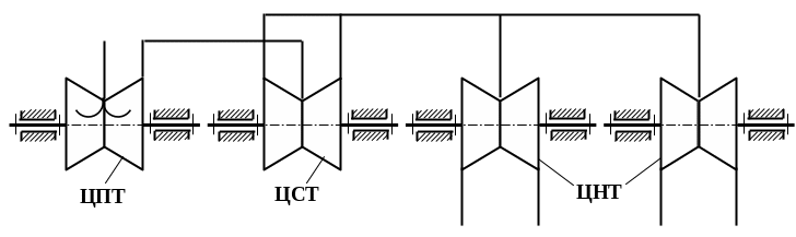 Рис.1. Приблизна схема потоків пари у багатоциліндрової паровій турбіні