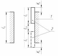 Рис. 8.1. Схема визначення дожини ходу хонінгування головки: 1-гільза; 2-хонінгований брусок у крайніх верхніх та нижніх положеннях