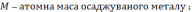 Теоретична маса нарощуваного металу. Залежність кількості речовини, що відновлюються на катоді і окислюється на аноді від природи речовин й обумов електролізу була досліджена М. Фарадеєм, який встановив, що для виділення або розчинення під час електролізу 1 г-екв. Речовини витрачаються близько 96490 К електрики / константа Фарадея /. Звідси рівняння маси нарощеного металу