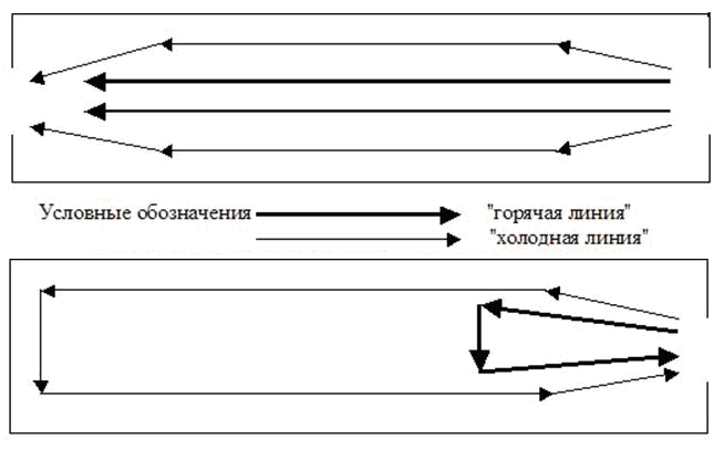 Для разделения всего ассортимента товаров, поступающих на склад, на данные две группы, используют правило Парето (20/80), которое применительно к логистике складирования состоит в следующем. Часто отпускаемые товары составляют лишь небольшую часть номенклатуры около 20% наименований. Располагать их необходимо в удобных, максимально приближенных к зонам отпуска местах, вдоль так называемых «горячих» линий (зон). Товары, требующиеся реже, остальные 80 % наименований номенклатуры, отодвигают на "второй план" и размещают вдоль "холодных" линий (зон) (рисунок 1.2). Вдоль "горячих" линий (зон) должны располагаться также крупногабаритные товары и товары, хранящиеся без тары.