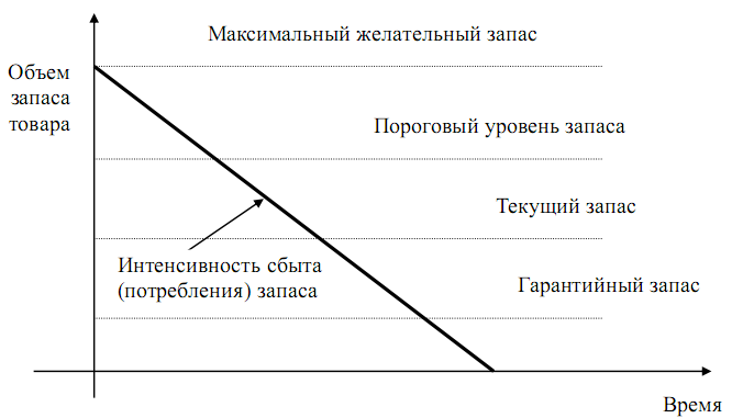 Текущие запасы — соответствуют уровню запаса в любой момент учета. Он может совпасть с максимальным желательным запасом, пороговым уровнем или гарантийным запасом. Предназначен для обеспечения непрерывности процесса производства или сбыта между двумя очередными поставками.