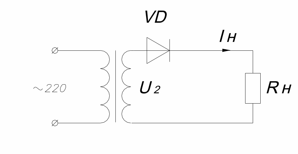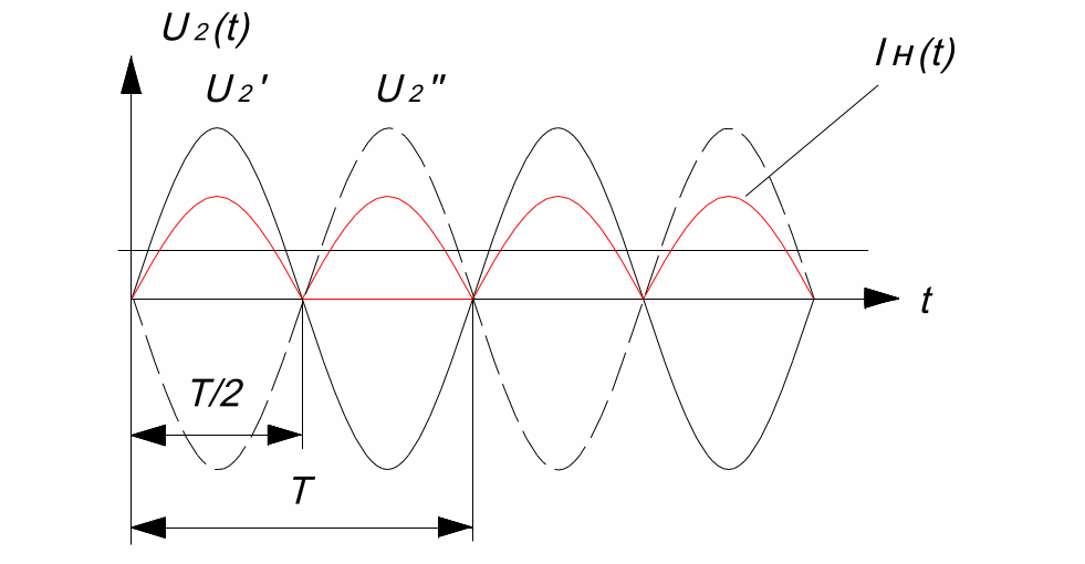 Особенностью однополупериодного выпрямителя является то обстоятельство, что по вторичной обмотке ток протекает только пол периода, остальные пол периода трансформатор на холостом ходу. Однополупериодный выпрямитель имеет значительный уровень пульсаций.