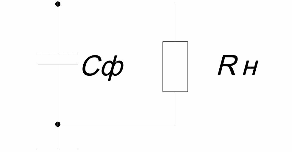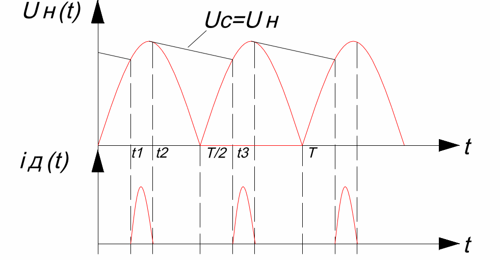 При включении в схему выпрямителя сглаживающего конденсатора, интервалы времени, в течение которых диоды открыты или закрыты нарушаются. Диод открыт только тогда, когда входное напряжение превышает напряжение на конденсаторе. В остальные интервалы времени диод заперт. В связи с тем, что конденсатор используется большого номинала, а нагрузка, как правило, потребляет постоянный ток, можно считать, что в течение полупериода конденсатор разряжается постоянным током.