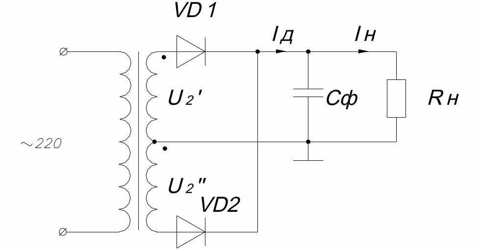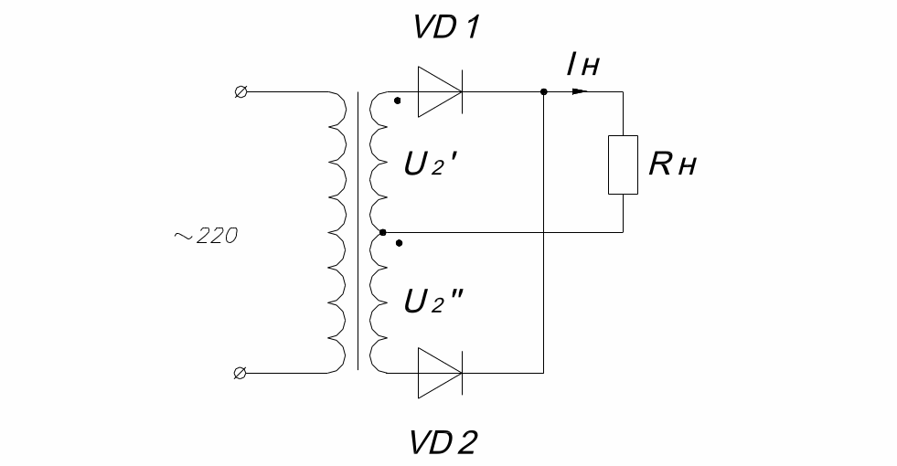Достоинство: меньше пульсации в схеме и среднее напряжение в два раза выше по сравнению с однополупериодными.
